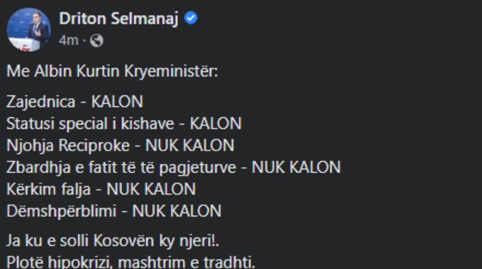 Deputeti i LDK-së, Driton Selmanaj ka reaguar pas përfundimit të takimit mes Kurtit dhe Vuçiqit në Bruksel.