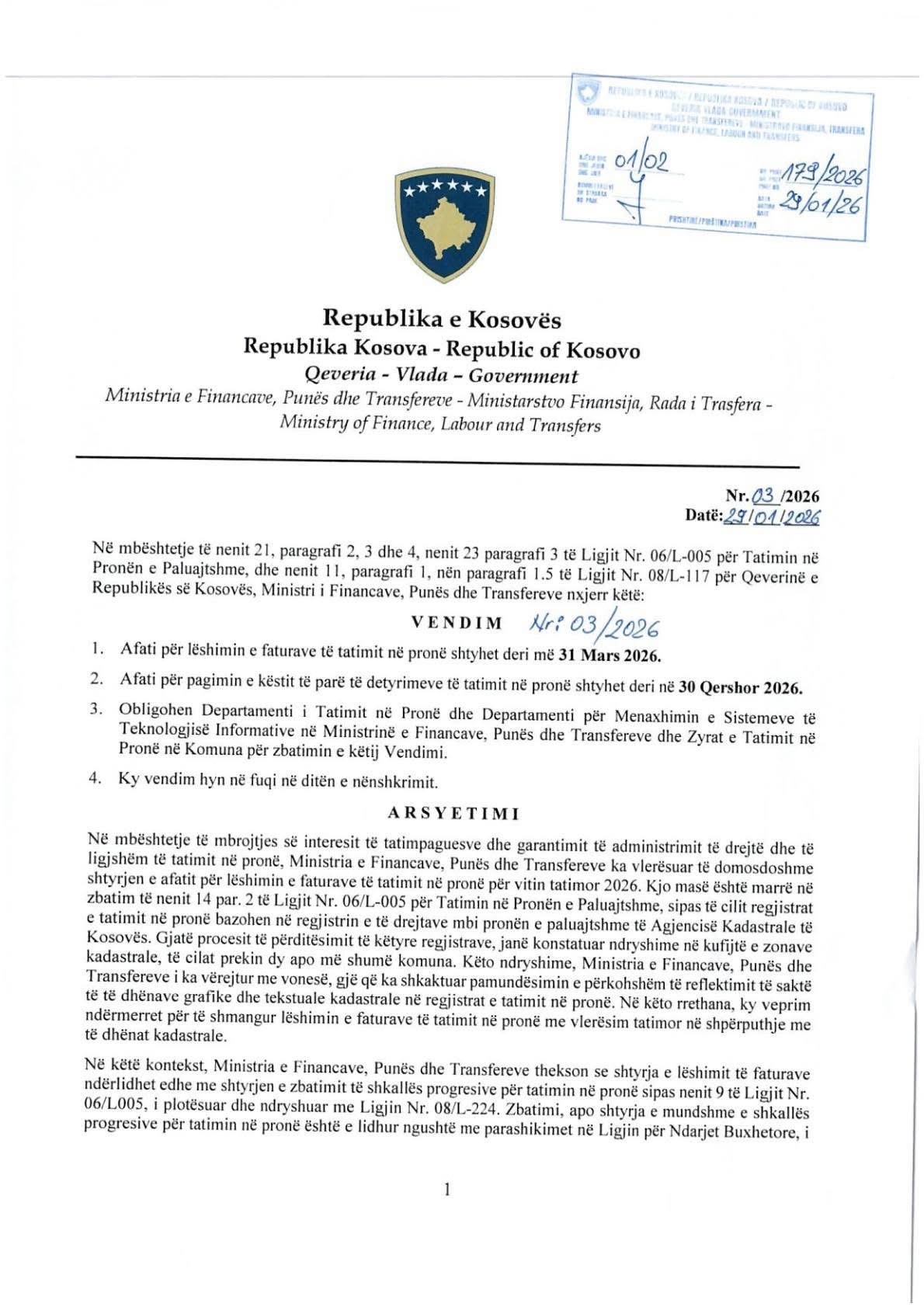 Ministria e Financave, Punës dhe Transfereve ka marrë vendim që afati për lëshimin e faturave të tatimit në pronë të shtyhet deri më 31 mars 2026, kurse afati për pagimin e këstit të parë të detyrimeve të tatimit në pronë të shtyhet deri më 30 qershor 2026.